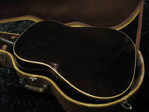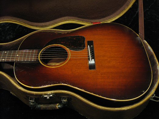 Excellent Condition!バナーロゴ1942年製J-45が入荷しました。激シブのウェザーチェックがこのギターの歴史を物語っているようなウォータイム物。マホガニートップや太いネックもこの年代ならではです。クラックもなく塗装の程度も極上です。ナット、サドル交換により弾き易い弦高でセットされています。ハードケース付き