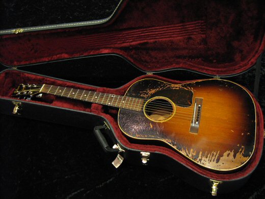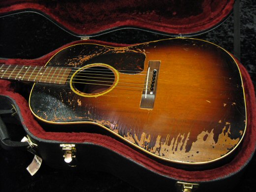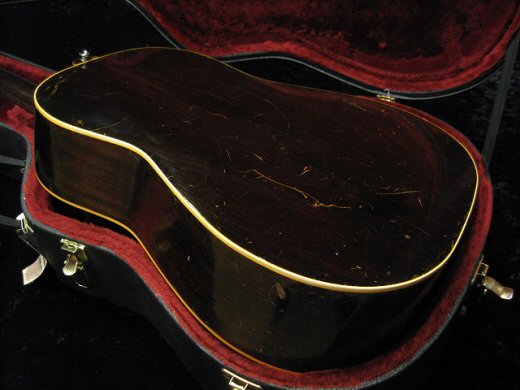リチャード・ギアコレクションから1944年製J-45を大特価で放出します!ズドンと図太い低音が魅力の大迫力サウンド!!ペグ、交換、リフレット、ブリッジ貼り直し。ネック状態は良好でロッドも十分に余裕がございます。トップ板はレアなマホガニー仕様。プレイヤー誌でも紹介されております。