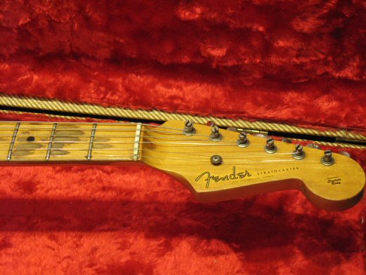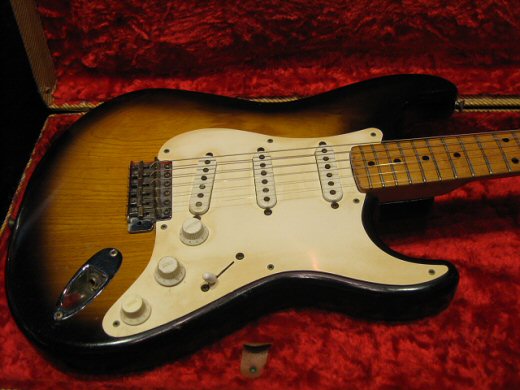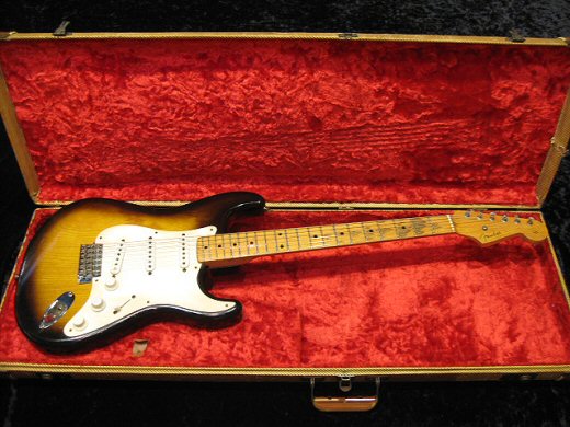 コンディション抜群の’55年製ストラトが入荷です!杢目のきれいなアッシュボディは塗装のダメージも僅かな良い状態です。ネックは太めな軽いトライアングルシェイプで’55年製の特徴がよくでていると思います。フレット、ナットもオリジナルです。アッセンは半田バージンのフルオリジナルでピックアップ上下のゴムワッシャーのみ交換。トーンノブが1個後年のナイロン製に交換されていますがそれ以外はピックアップカバーも含めオリジナルベークライトです。オリジナルアーム、バックプレート、ツイードケースが付属致します。数年前の約半値での大放出です!!!