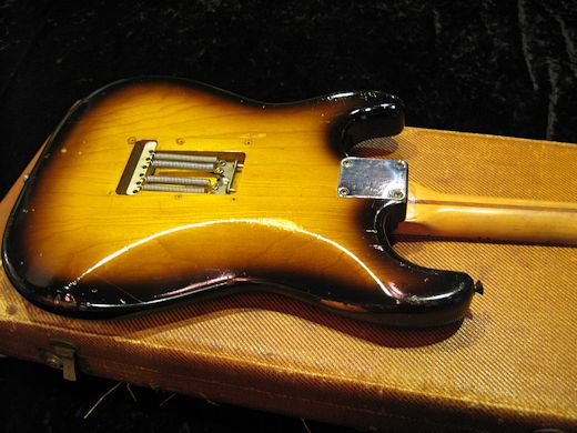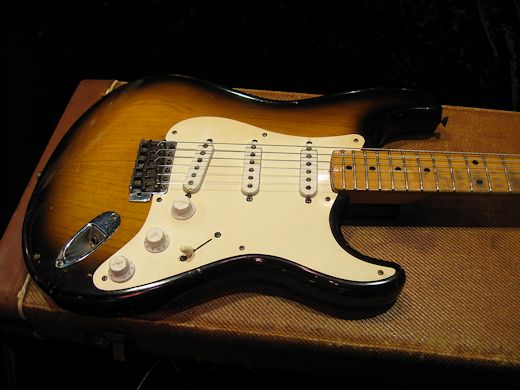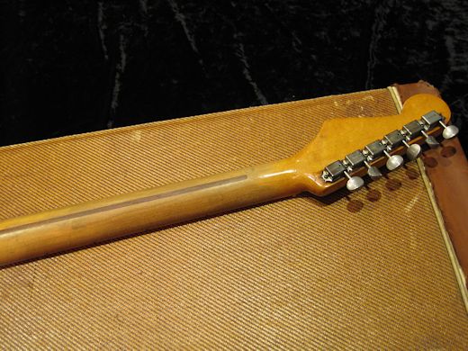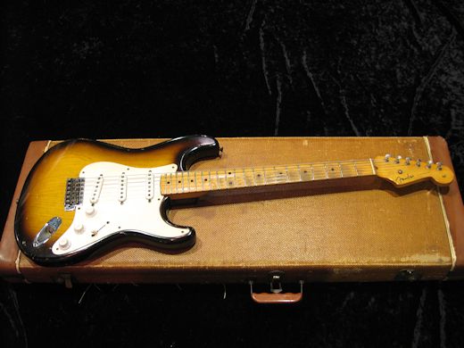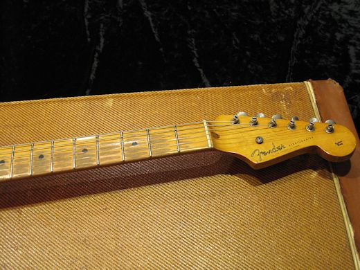 ぶっ飛びサウンドです!1955年製ストラトキャスター入荷しました。美しい木目のアッシュ1ピースボディストラト、年式なりに弾かれてきた風格があります。数個のイモねじ交換はございますがベークライトパーツ、ショートGマグネットのピックアップはじめ他はオリジナルをキープ、半田はバージンです。フレット、ナット交換済みで演奏性は大変良好。リア、センターの音もご機嫌ですが特にフロントピックアップの粘り、抜け感は本当に素晴らしいです!!ボディデイト11/54、ネックデイト2/55、ポットデイト54年35週目。超お勧めのメイプルネックストラトです。オリジナルセンターポケットツイードケース付