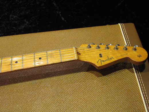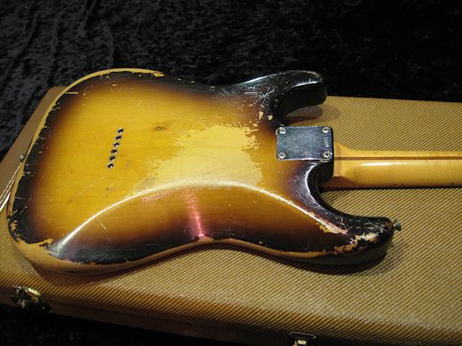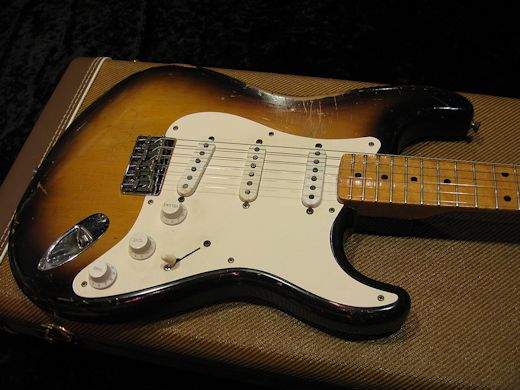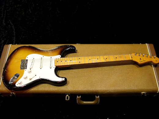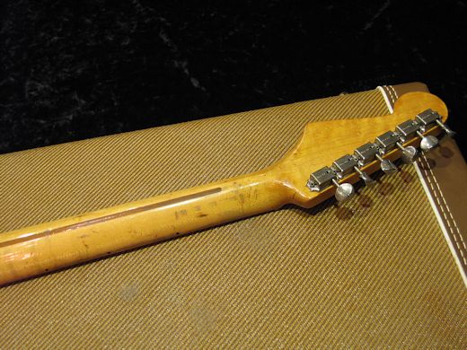 1956年製ストラトキャスターの入荷です。アルダーボディ、ベークライトパーツの’56年後期のスペック。握り易い厚みのVシェイプグリップ、リフレット、ナット交換済みでプレイフィール抜群です。アタック感や分離の良さはハードテイルならではの極上サウンドです!!スイッチキャップ、ジャック交換、その他パーツはオリジナルをキープしております。ナイスプライスです!!ノンオリツイードケース付き