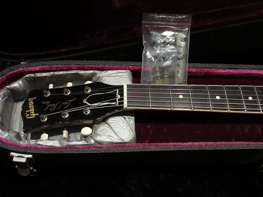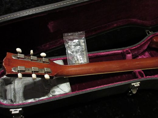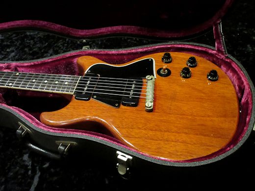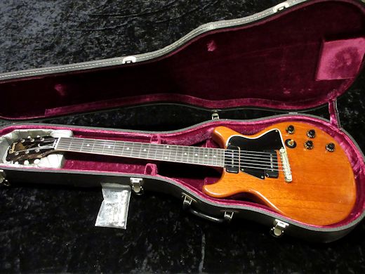サウンド抜群のプレイヤーズギア!1959年製レスポールスペシャルが入荷しました。フロントピックアップがネック寄りに付いている前期型のスペシャルです。ミッドサイズの59プロファイルネックのグリップ感は最高、リフレット、ナット交換済みです。オリジナルP-90と乾いたホンデュラスマホガニーから放たれるサウンドにノックアウトされて下さい。現在ブリッジを交換(オリジナルは付属します)その他アッセンブリー、ヴォリュームノブ、トラスロッドカバー、ジャックプレート交換、ネックヒール部のクラック修理歴あり。ウエイト3.42㎏。70Sギブソンケース付き