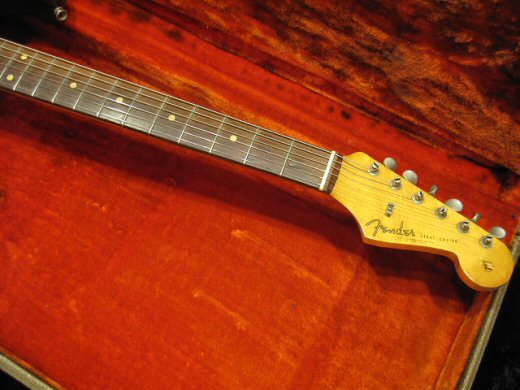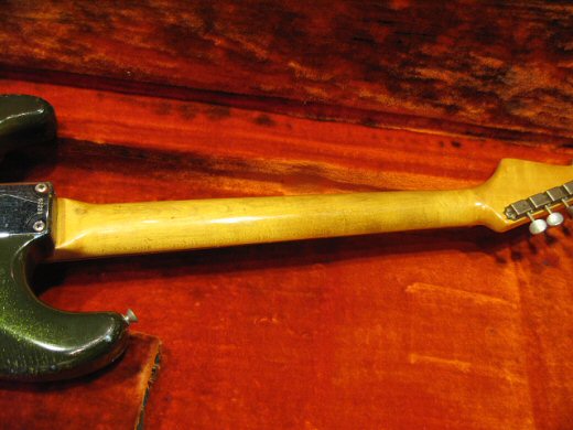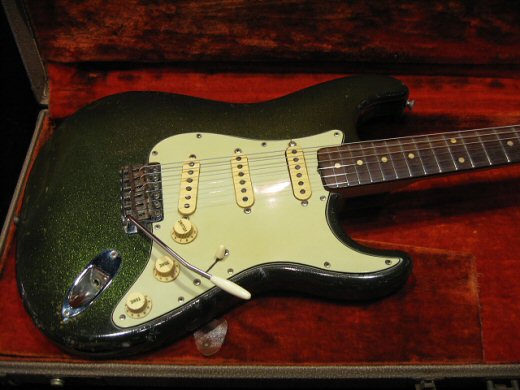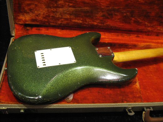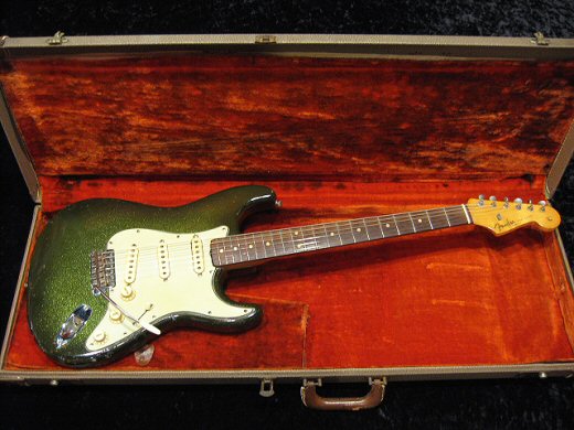 ウルトラレアカラー!!スパークルグリーン1961年製スラブボードストラトです。サンバーストベースの俗に言うマルチレイヤーカラーですがこの色はまずお目にかかれないと思います。ナット、フレット、いくつかのビス交換以外はオリジナルパーツです。その他詳細はお問合せ下さい。オリジナルブラウントーレックスケース
