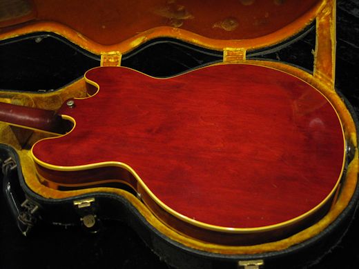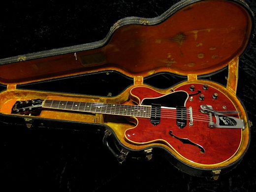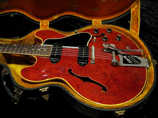 Factory Bigsby搭載のcoolな1961年製ES-330TDCの入荷です。濃いチェリーレッドに黒カバーのP-90、ニッケルハードウエアの人気の年式、ビグスビーユニットも外観の雰囲気を高めております。リフレット、ナット交換済みで演奏性も良好。ポットデイト61年4週目、オリジナルブラックビューティコンデンサーです。ナイロンサドルとフロントボリュームポットのみ近年のCTSへ交換されております。とにかく艶やかでメローなサウンドは絶品!オリジナルハードケースが付属致します。