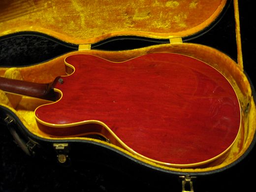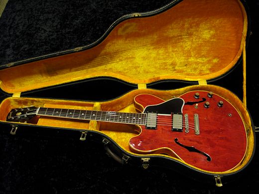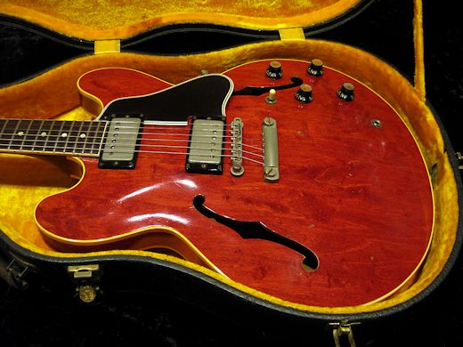 ドットチェリー!1961年製ES-335TDCが入荷しました。約1年間ほどしか無いドットマーカーのチェリーレッド335。ピックアップはPAFです。年式相応の経年感を放つ渋いルックス、ウェザーチェックは少なめで大きなダメージは一切ございません。肝心のサウンドの方は、、、かなりキテマス、テンション感が素晴らしく、ラウドな生鳴りがギターの持つポテンシャルを感じさせてくれます。プラグインするとPAFの凄さが一瞬で分かる艶やかで芯の太いトーン、のびやかなサスティーンをご堪能頂けるかと思います。リフレット、ナット交換済みで演奏性は大変良好。ビグスビー取り付け痕あり、テールピースとサドルのみリプロパーツとなっております。オリジナルハードケース付き
