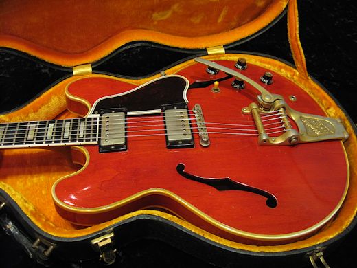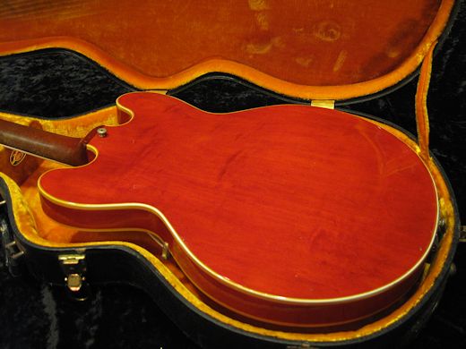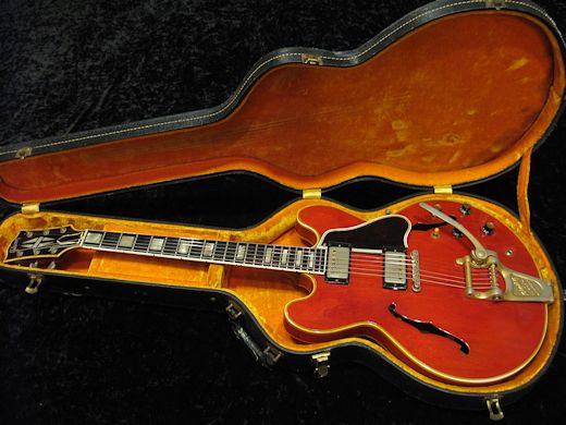 PAFサウンド!Factory Monoralの1961年製 ES-355TDC入荷しました。オプションのモノラル仕様は335と同じシンプルな回路構成が魅力。オリジナルPAFのサウンドが素晴らしく艶っつやで色気あるトーンです!ポットは近年物へ交換されておりましてコンデンサーはASTRONです。修理履歴は無く、フィニッシュも美しい赤味を保った状態の良いヴィンテージ335です!オリジナルハードケース付