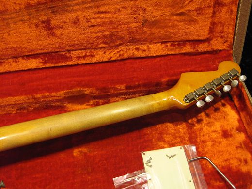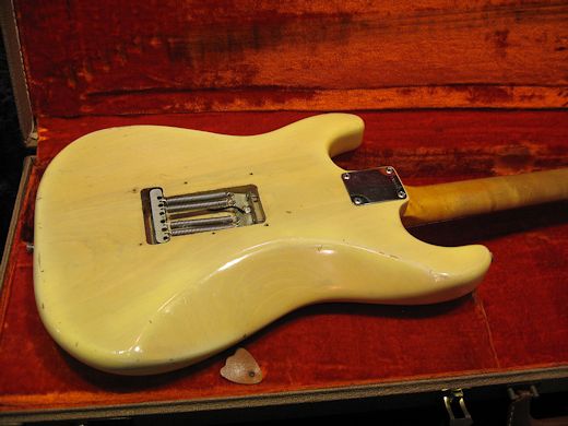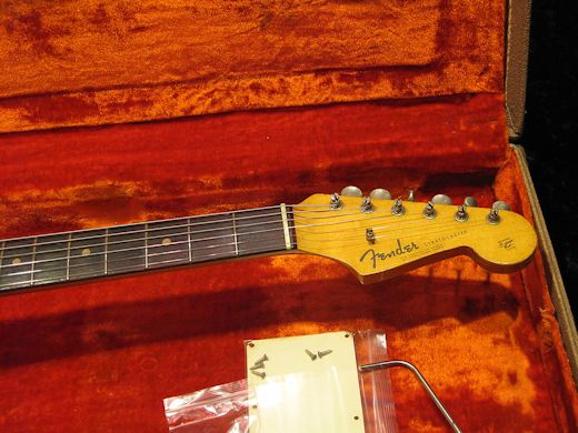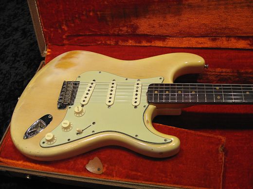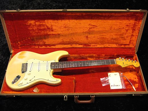 Great sound !! 1963年製オリジナルブロンドのストラトキャスター入荷しました。木目が透けて見える非常に美しいブロンドカラーのストラトです。ダークなブラジリアンローズウッドフィンガーボードと相まって抜群のルックスを誇ります。フレット、ナットのみ交換でパーツ類はオリジナル、半田もバージンです。ピックガードは余り縮んでおらず、割れもございません。シンコーミュージックムックの「The Authority of STRATOCASTER」掲載の貴重な個体。探して見つかるようなシロモノではございません、お早めに。オリジナルハードケース付き