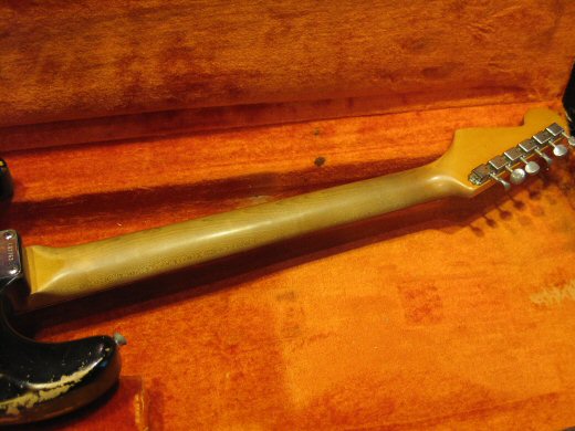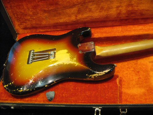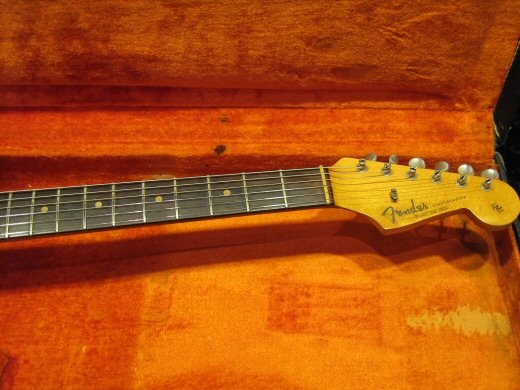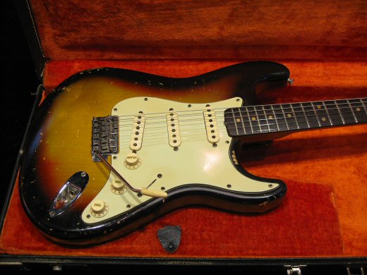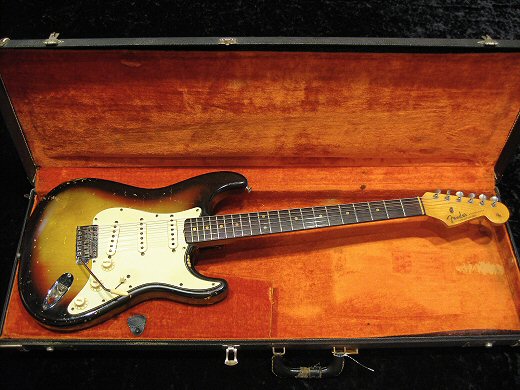 迫力のサウンドです!1963年製ストラトキャスターです。弾き込まれとても渋いルックスで塗装が剥がれたネックの質感もグッドフィーリングです。パーはリフレット、5wayスイッチとジャックが交換されております。特に中低音にパンチがあり、図太いトーンが持ち味のストラトです。ブラックトーレックスケース付き