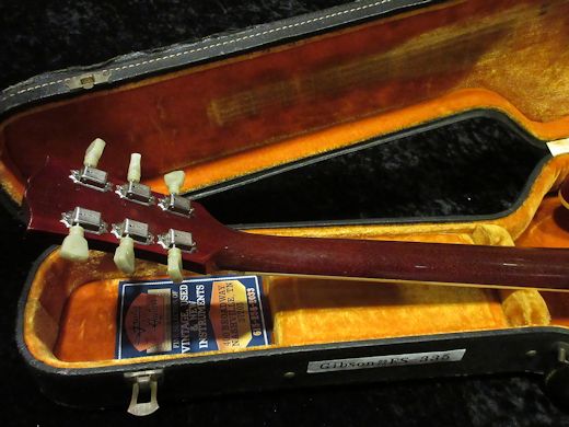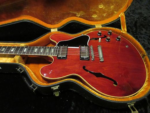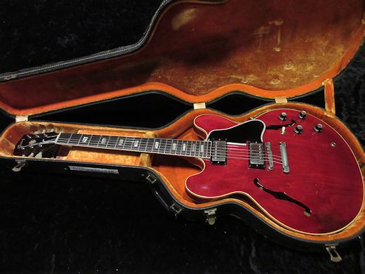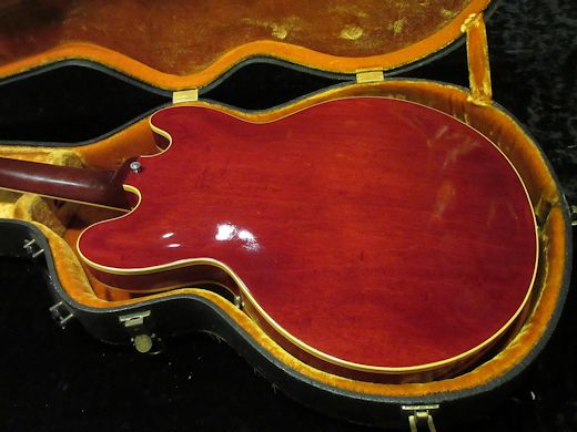 Great Condition! 1963年製ES-335の入荷です。製造開始から約60年を経ても尚、Gibsonの人気機種であり続けるES-335。今回入荷の1本はその中でも1番人気と言っても過言ではないブロックマーカーのチェリー。フロントにPAF、リアにナンバードPAFを搭載しています。ホーン部分は所謂「ミッキーホーン」と呼ばれる形状で、後年の尖ったものではなく50sを彷彿とさせるシェイプです。退色の少ない、艶のある美しいカラーリングを保っており、ピックアップカバー等の金属パーツもとても綺麗です。ルックス・サウンド・コンディションと3拍子揃った極上機、これだけ綺麗なものは近年本国アメリカで見かけることも少なく、滅多に入荷しませんのでお早目のお問い合わせお待ちしております!オリジナルハードケースが付属致します。