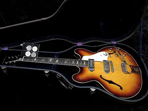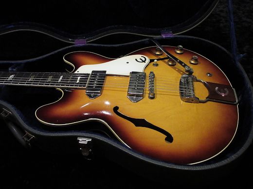 Great condition !!1964年製エピフォン カジノ入荷しました。ALL NICKEL PARTS、17度ヘッドアングル、WIDE NECK、黒々としたハカランダ指板の1964年製カジノ。トップコートの艶が残っていて退色の少ないとても綺麗なサンバーストです!リフレット、ナット交換済みで演奏性は大変良好、その他パーツはオリジナルです。クランチ程度の歪みで弾くと超気持ち良いバッキングサウンドが放たれます!極上コンディション&サウンドの貴重な64スペックカジノです!!!Hang tag、オリジナルハードケース付き