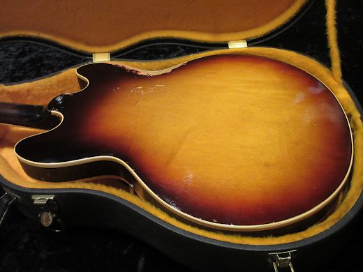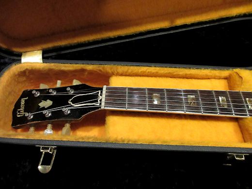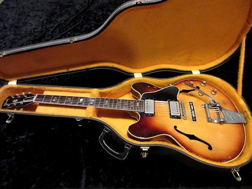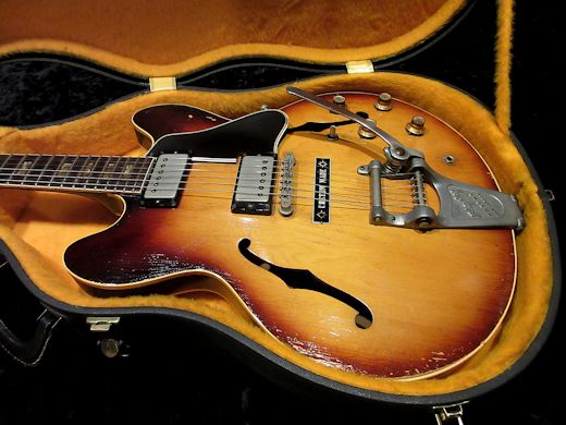 Factory Bigsby仕様の超クールな335入荷しました。黒光りしているハカランダ指板、無数のウェザーチェックや塗装面の傷など使われてきた本物のヴィンテージギターでしか出ないオーラを纏った1964年製のES-335TDです。芳醇な倍音に芯の太い腰の強いサウンドは絶品!リフレット、ナット交換済みの即戦力機です。とにかく格好いいファクトリービグスビー搭載のES-335TD、オリジナルハードケースが付属致します。