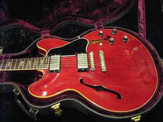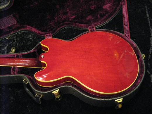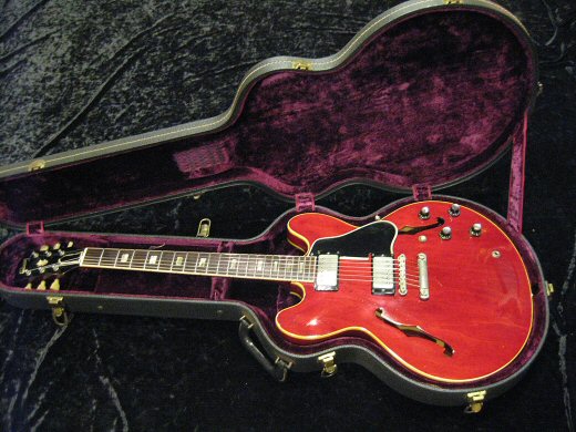 ’64年製ES-335TDCの入荷です!初期センターブロック、オリジナルストップテールピースと最も人気の高いスペックです。リフレット、ナット交換以外は全てオリジナルパーツ!!画像はやや明るく写っていますが実物は濃く深みのあるチェリーカラーです。サウンドも最高。年代ズレハードケースになります。