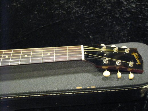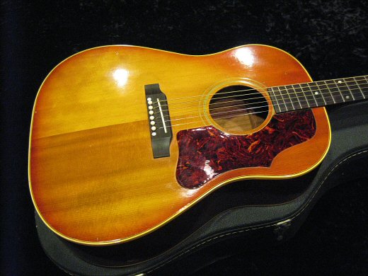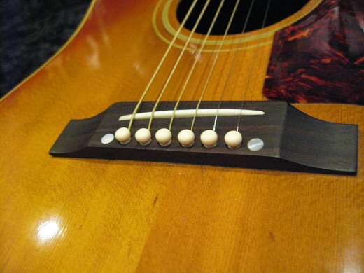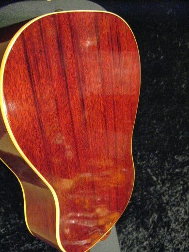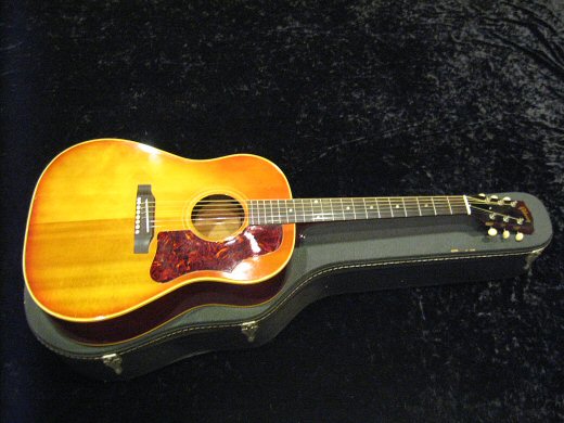 ’64年製J-45の入荷です。アジャスタブルからのブリッジ交換がなされていますが乾いた良い鳴りです。ナット、フレット交換、ネック状態良好で演奏性抜群です。12フレット部の弦高は6弦で2.1mm、1弦で1.6mmです。THINピックガード、ハカランダ指板!!ハードケース付属。