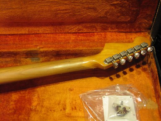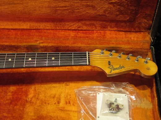 オリジナルレイクプラシッドブルーの1965年製ストラトキャスターの入荷です。比較的色焼けが少なく濃い青みをキープしています。現在5ウェイスイッチへの交換がございますがオリジナルは付属しています。その他パーツ類は全てオリジナルです。リフレット、ナット交換済み。キャビティ部に導電塗料が塗られていた形跡がありますが、ほとんどリムーブされております。ネックデイト65年6月、ポットデイト65年16週目。リプロアームバー、オリジナルブラックトーレックス付き