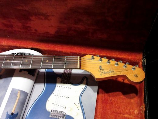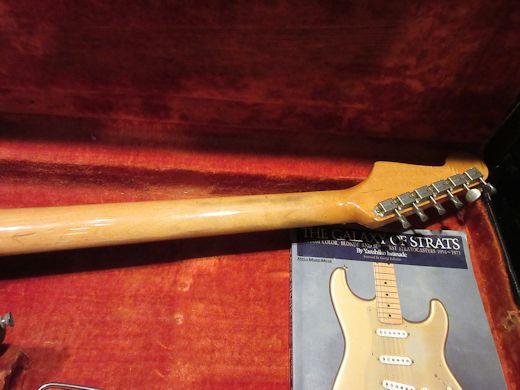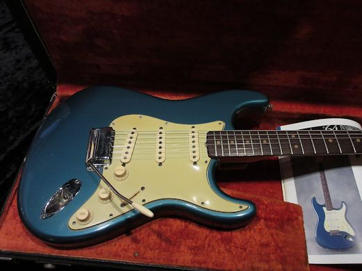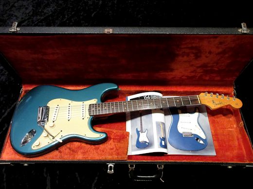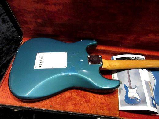 THE GALAXY OF STRATS掲載の逸品!レイクプラッシッドブルーのストラト入荷しました。グリーニングの軽微な深い青にミントグリーンガード、ハカランダ指板、クレイドットのPre CBSスペックの極上ストラトです。グレーボビンながらブラックボビン期と同じフォームバー被膜のピックアップで63年辺りに近いニュアンスの素晴らしいサウンドです。POT DATE’64、PICKUP DATE’64、NECK DATE 1/65。抜群のコンディションに加え有名書籍掲載の超貴重なストラトです!!アームバー、ブリッジカバー、オリジナルハードケースが付属致します。