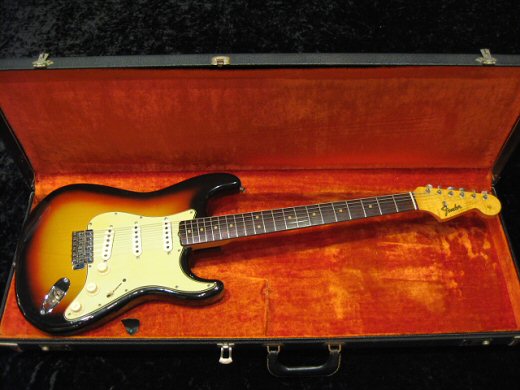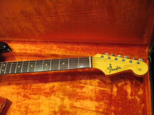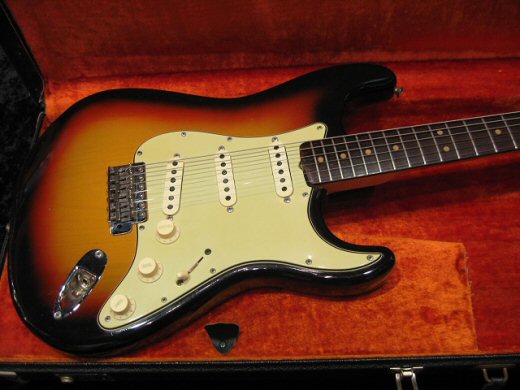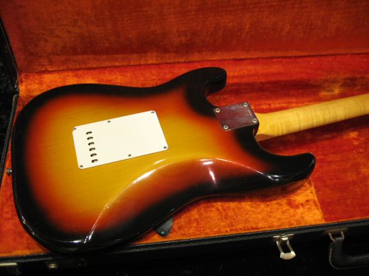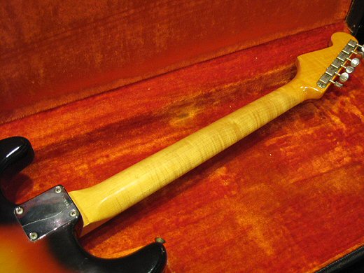 スーパークリーン&トラ目ネックの1965年製ストラトキャスターです。ヘッド表にまで杢が浮かんでおり超クールなルックスです。ブラジリアン指板、グリーンガードの’65最初期スペック!!ネックデイトは’65年1月。フルオリジナル(ナットは交換していますがオリジナルはケースにあり)でコレクタブルなストラトです。オリジナルハードケース