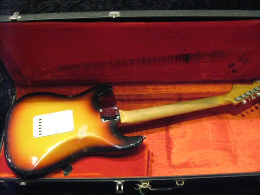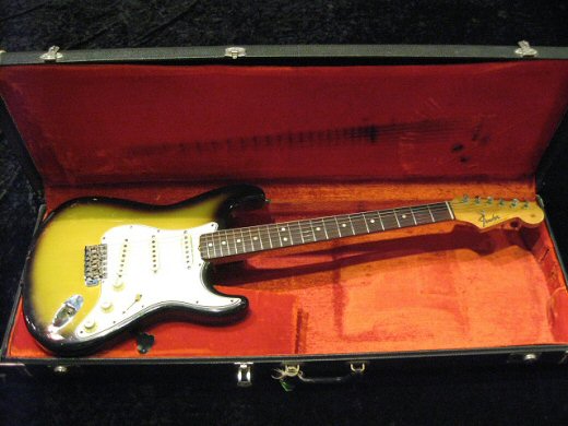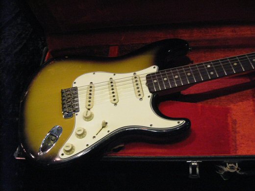 ’65年製ストラトキャスターの入荷です。ボディトップの赤みが褪色して2トーンのようになっています。リフレット、ナット交換、ピックアップマウントスクリュー交換。ハードケースはやや年式ズレです。超大特価!