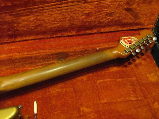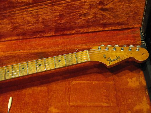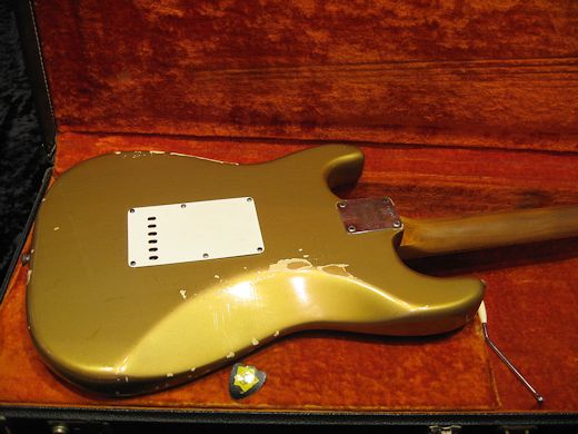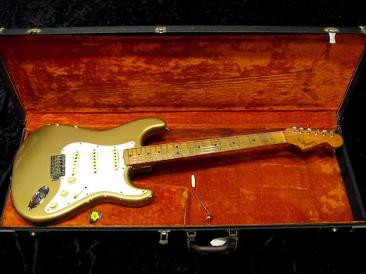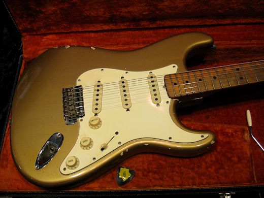 Original Shoreline Gold! ! Maple cap neck !!1965年製ストラトキャスター入荷しました。スーパーレアなスモールヘッドの貼りメイプルネックにショアラインゴールドという奇跡のスペックです。非常に惜しい事にセンターピックアップ部のザグリ埋め直しがありますのでフェアプライスでご提供させて頂きます。フレット、ナット、5点スイッチ以外はオリジナルパーツです!サウンドは強力の一言です。オリジナルハードケース付