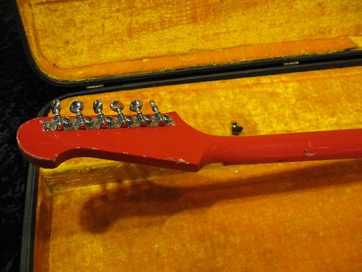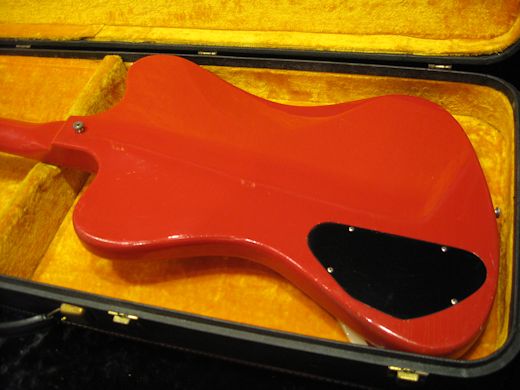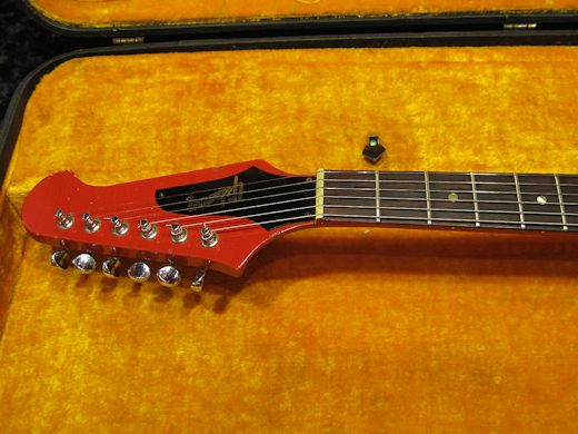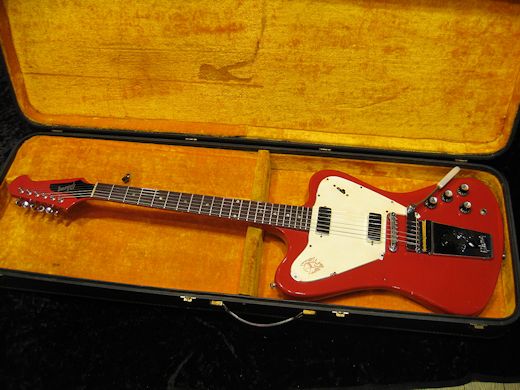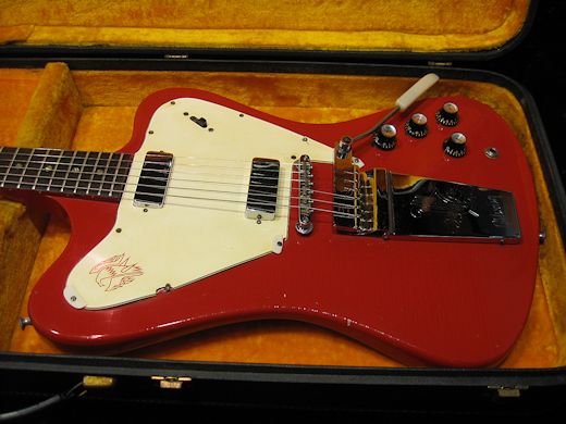 Super Rare !! Original Cardinal Red Finish !! 1966年製ファイアーバードV入荷しました。標準カラーのサンバーストでも生産本数の少ないモデルですが、今回入荷したのはカスタムカラーのカーディナルレッド、しかもフルオリジナルです。ミニハムバッカー、クロームメッキのABR-1、ロングバイブローラー等上位機種ならではの仕様。ピックガードは一部縮み、割れの補修が入ってますがフィニッシュの状態は良く、抜群に格好良いファイアーバードです!めったに出ないレアモデルですのでお探しの方はお早めに!!オリジナルハードケース付