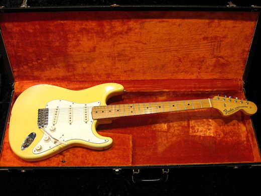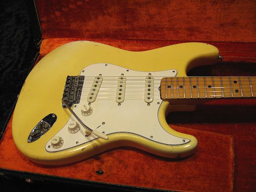 貼りメイプル+オリンピックホワイト!!1969年製ストラトキャスター入荷しました。ストラトファン垂涎のアイテム68年製の貼りメ。本機はボディカラーの色焼け加減も絶妙で超クールなルックスです。コンプレッション感強めのハリメ特有の太いサウンドが堪りません!ナット交換、リフレット済み。ピックガードは経年劣化の為、65~68年辺りの物へ交換されております。めったに市場へ出ない69年製貼りメイプルストラトこの機会をお見逃しなく!!オリジナルハードケース付き