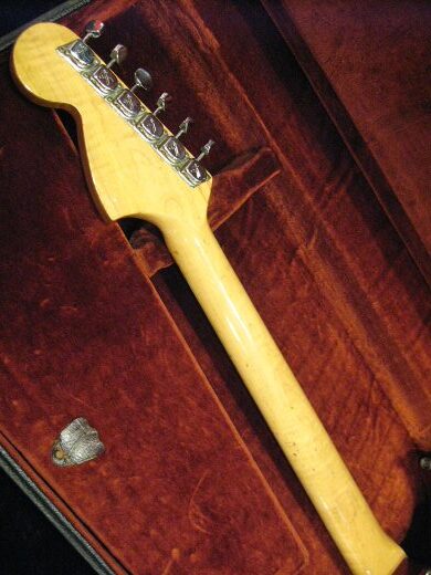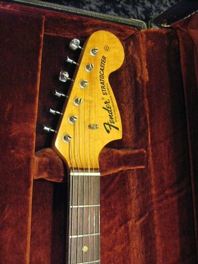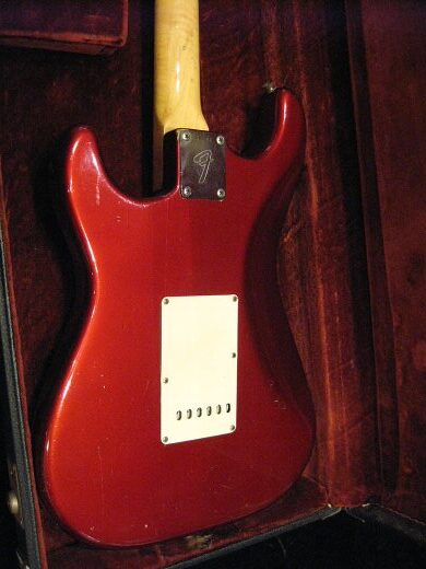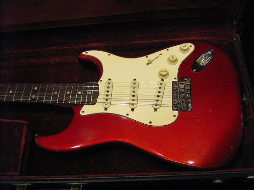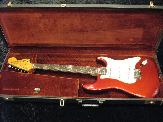 ’70年製キャンディアップルレッドの入荷です。パーツ交換はナット、レバースイッチ、サドルイモネジのみとオリジナル度の高いカスタムカラーストラトです。やや後年式のブラックトーレックスHC。