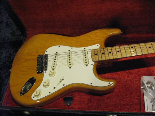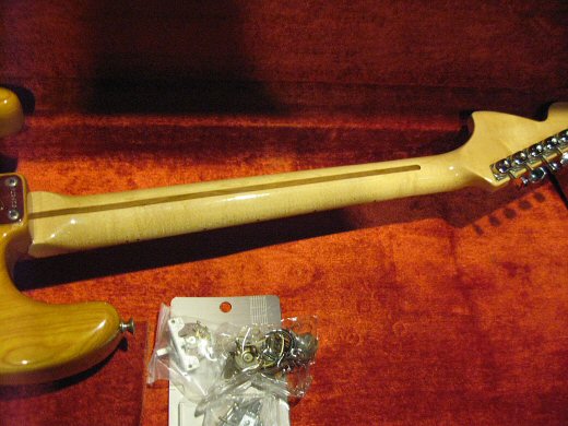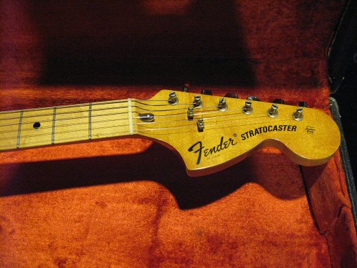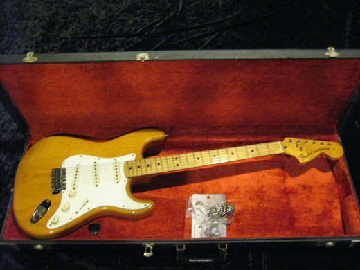 大変コンディションの良い’73年製ストラトの入荷です。現在アッセンはブレンダー仕様となっていますがオリジナルは全て付属します。チタンサドルへ交換ですがこちらもオリジナル付属。ピックアップはオリジナルでブラックボビン。3.58KGととても軽量で生鳴り最高の1本です。PUキャビティに導電塗料が施されておりノイズ面の対策もバッチリ!フレット、ナット交換済み。オリジナルHC。