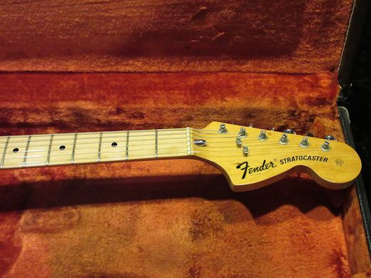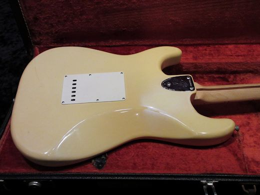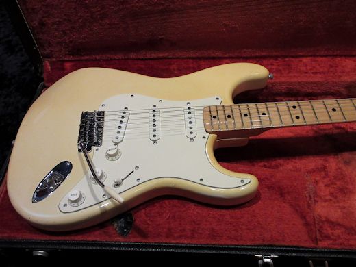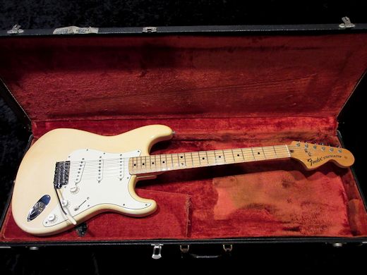 人気の高い白メイプルの1973年製ストラトキャスター入荷しました。軽量なアルダーボディにグレーボビンピックアップ、オリンピックホワイトカラー、70年代ストラトの定番アイテム!綺麗な卵色に色焼けたボディカラーが最高です。オリジナリティは高く、コンディションも非常に良いラージヘッド白メイプルストラトです!オリジナルブラックトーレックスケース付き