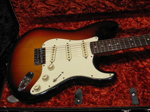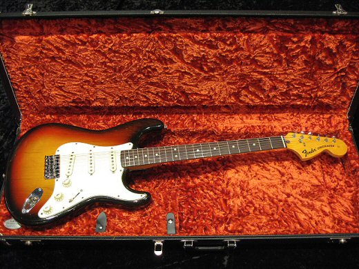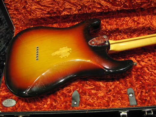 美しいサンバーストフィニッシュの1973年製ハードテールストラトキャスター入荷しました。ピックアップデイト、ネックデイト、ポットデイト全て’73年でスイッチのみ5WAYへ交換。リフレット、リナット。3.22kg 超軽量です!近年のフェンダー製ハードケースが付属します。