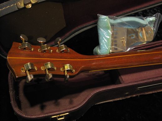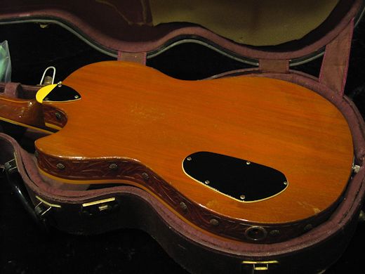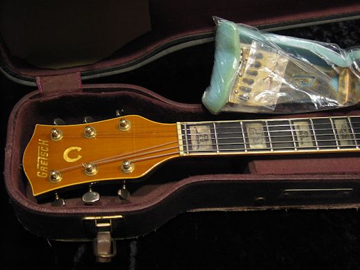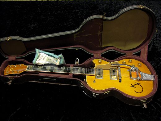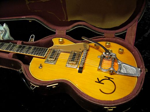 レアモデル!1975年製Country Rocの入荷です。70年代の僅かな期間生産されていたUSA製の珍しい機種です。ウエスタンインレイ、バックルテールピース、ボディサイドに巻かれた皮のウエスタンモチーフ、Gの焼き印等’50年代Round upの’70sバージョンになります。現在ビグスビーがマウントされていますが、オリジナルテールピースは付属してますのでもとへ戻せます。生産本数極小の貴重なモデルですのでお探しだった片はお早目に!!オリジナルハードケース付き