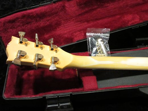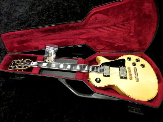 1980年製レスポールカスタム入荷しました。卵色に焼けた絵になるレスポールカスタムです。メイプルネックの抜けの良さに枯れたニュアンスのトーンが絶妙なナイスサウンドの1本です。ウエイトは4.19kgと軽量。現在テールピース、ブリッジ、ノブ類は交換しておりますがオリジナルは付属致します。フレット、ナットもオリジナルですが残量は有り演奏性も良好。激しく歪ませたサウンドも最高です。オリジナルハードケースが付属致します。