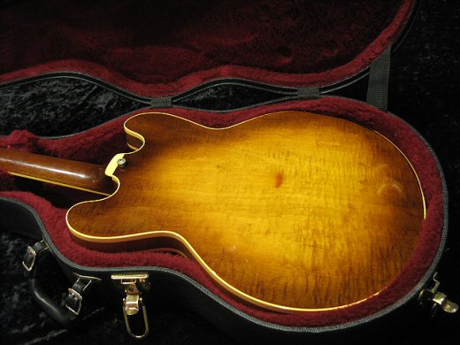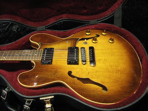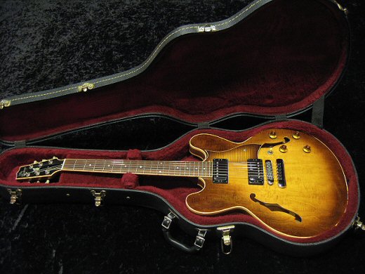 イーグルのヘッドインレイが印象的なLTDモデルH540の入荷!近年物ES-335との比較しますとよりタイトで温かみのあるサウンドです。ピックアップはシャーラー製でブルースはもちろんJAZZでもばっちりハマる芯の太さの感じられるトーンです。全てオリジナルパーツでフレットは2,3フレット辺りに僅かに減りがありますが全体としては9分は残っております。適正な弦高を保てるネック状態とトラスロッドも両方向へ余裕がございます。ディープジョイント、木製のピックガードや塗装の薄さなどカラマズーのクラフトマンシップを感じる価格以上に素晴らしいギターです!オリジナルハードケースですが取っ手のみ汎用品へ交換されています。ウエイト3.45kg軽いです。