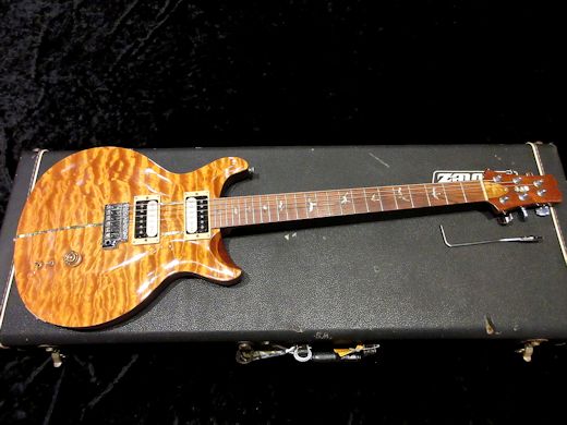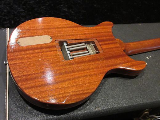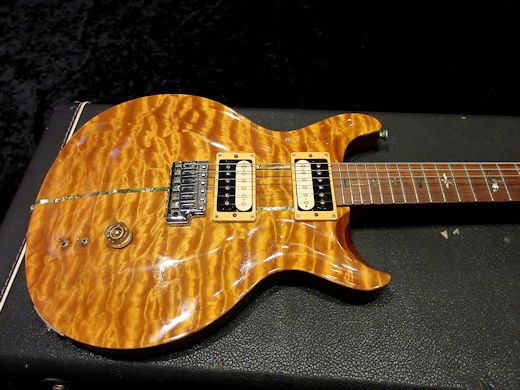 ハイグレードキルテッドメイプル、ハカランダ指板のサンタナ風モデル入荷しました。1990年代にGUITAR HOUSEさんプロデュースで製作されたPRSサンタナレプリカです。極薄ラッカー塗装、キルテッドメイプルトップ、マホガニーバック、マホガニーネック、ハカランダフィンガーボードのハイスペック、更にはPRSトレモロ、スイートスイッチ、コイルタップを搭載しております。ピックアップはリア/ダンカンJB、フロントダンカン/59。ネックは真っ直ぐでトラスロッド余裕有り、フレット残は90%以上とプレイングコンディションはとても良好です。価格以上のサウンド、スペックの珍品!ウエイト3.46㎏。ハードケース付き。当時の参考価格¥398000