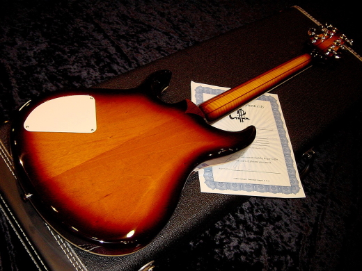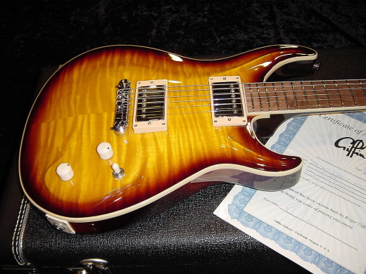 流行のチャンバー構造(ホローボディ)のギフィン・スタンダードの入荷です。ハードメイプル2Pトップ、ホンデュラスマホガニーバック!指板、ヘッド付板はブラジリアン(ハカランダ)です。エアー感のある鳴りはメロー&ファット!