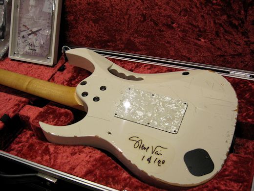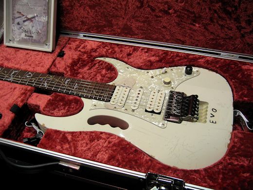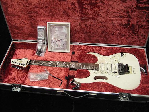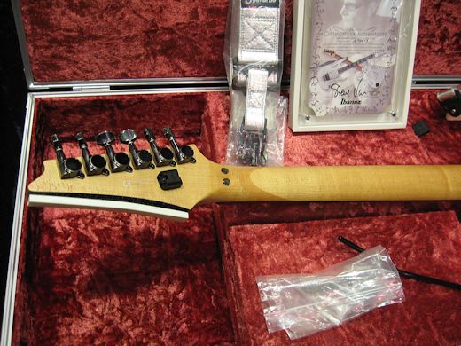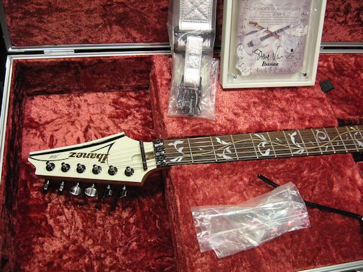 Steve Vai Signature Model 国内取扱い僅か5本のレアピース!ギターレジェンドの一人スティーブ・ヴァイのシグネチャーモデル”JEM”誕生から25周年を記念して製作された完全レプリカで、実機を元に傷や打痕を忠実に再現されています。抜群の弾き易さは特筆ものです。ほとんど弾かれていないコレクター放出品です!!直筆サイン入り認定書、フライトケース、ディマジオストラップ付