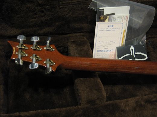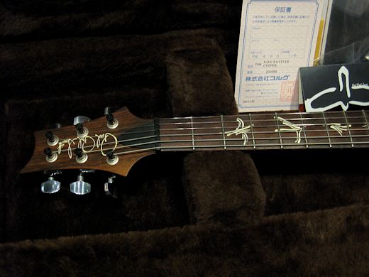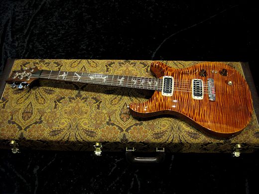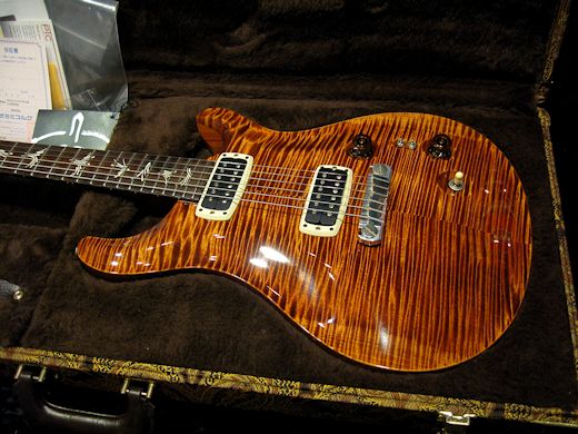 ポールリードスミスのアイデアが詰まったPaul’s Guitar入荷しました。分離感の良いサウンドで定評のある408Narrowピックアップを搭載、さらに各ピックアップをミニスイッチでコイルタップ出来、多彩な音作りが可能となっております。ブラスインサートのアルミブリッジは弦との接点部にブラス材を用い、サスティーンや倍音のさらなる向上が図られています。ニュータイプのバードインレイ、目の詰まった素晴らしいフレイムメイプルなどルックス面も申し分なし。今回入荷分は非常に綺麗な状態で、フレットは約9分残り、ストレートネックです。オリジナルハードケース付き