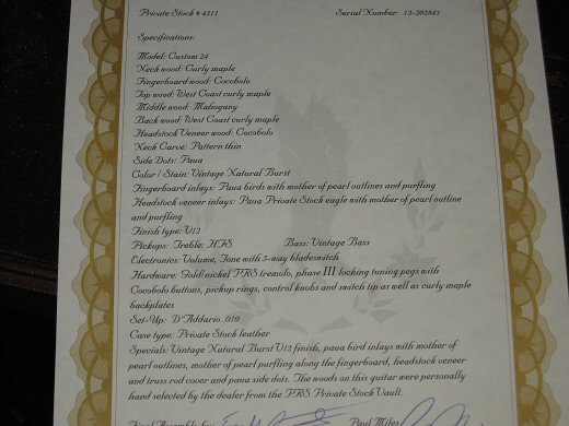 未使用の極上品!!Private Stock Custom24 Curly Maple with Cocobolo Wood。ボディはマホガニーを杢目の美しいカーリーメイプルでサンドされています。指板、ヘッドトップ、エスカッション、ノブはCocobolo材が採用され全体の統一感が出ています。その他スペックは画像のスペックシートでご確認下さい。2013年製で未使用新品同様品です。オリジナルハードケース付き