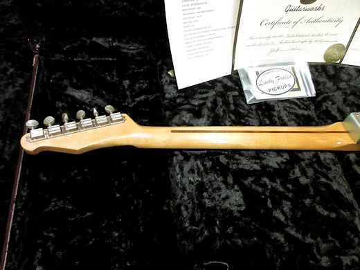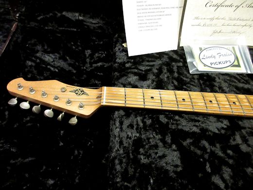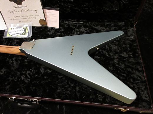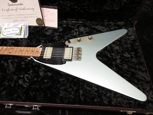人気モデルTeeVee入荷しました。FLYING VシェイプのボディにTLのアッセンブリーが有名なモデルですが、本機はRS/FRALIN PAF搭載の2ハム仕様です。ボディは国内有名工房にてラッカーリフィニッシュされ、アイスブルーメタリックに近いクールな雰囲気に仕上げられております。ストラップピンをロックタイプへ交換(オリジナル付属)、他は純正使用です。軽量なアッシュボディにハムバッキングの組み合わせで抜けが良いサウンドが魅力の1本。ウエイト3.19㎏。オリジナルハードケースが付属致します。