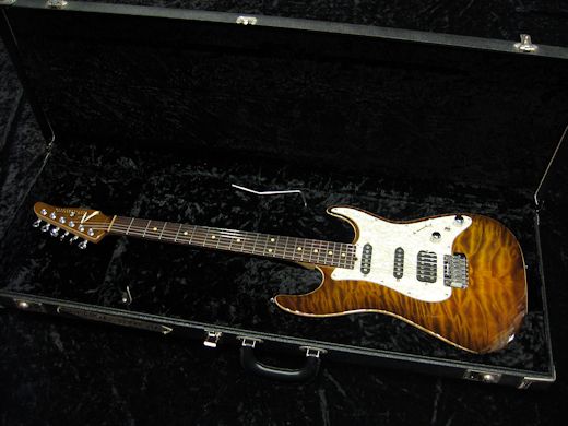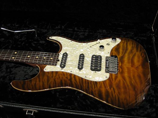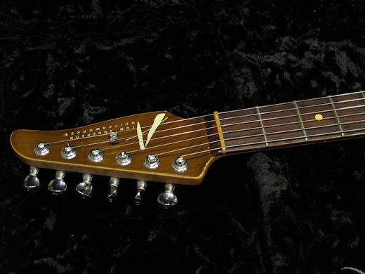 群を抜くプレイヤビリティ!トム・アンダーソン 入荷しました。ドロップトップボディにピックガードマウントのDT Classic、ピックアップはフロント/SA-1R、センター/SA-1、リア/H2+。電池の要らないVAブースター搭載により通常時から出力を上げることがミニスイッチによって操作出来ます、またトーンコントロールをPULLでフロントPU選択時にリアPUを足す事も可能となっています。極上のキルテッドメイプルが目を惹くギターです!目立つ傷は無く、フレット残十分、ストレートネック、調整済みです。ハードケース付